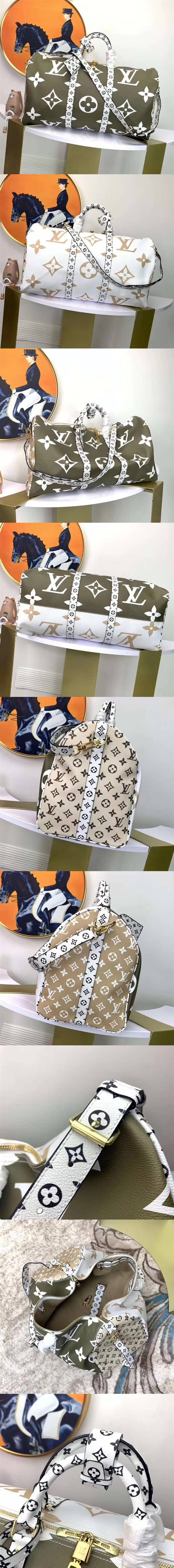高仿路易威登/LV KEEPALL 50 旅行袋,色彩搭配別出心裁,一側為卡其綠經典Monogram帆佈,另一側則為淡雅米色,放大版經典Monogram印花,創造引人矚目的視覺效果,款號:M44590