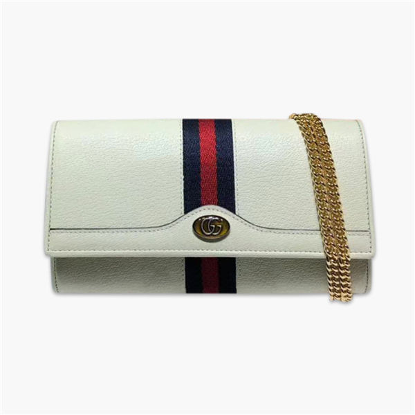 古馳/Gucci Ophidia 系列鏈條錢夾,選用細膩的織紋皮革精心裁制,巧妙糅合品牌的標志性條紋織帶,點綴金屬雙G橢圓形琺瑯,彰顯高雅品味,款號:546592【編號】546592#G075【顏色】白色【尺寸】19 X 10 X 3.5 cm【規格】翻蓋開合2個鈔票隔層1個拉鏈袋1個側貼袋12個卡槽鏈條肩帶【附屬品】防塵袋