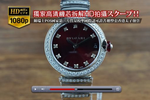 Bvlgari寶格麗(ZL廠-女表)LVCEA系列腕表 不銹鋼拋光表殼-表帶鑲嵌水鉆 裝載瑞士石英機芯 特點 LVCEA尺寸 表殼直徑33mm x厚度10mm機芯 Swiss quartz movement功能 時針、分針、中心大秒針、日歷(3點位窗式顯示)表殼 316L不銹鋼拋光表殼-由表圈、不銹鋼中框、不銹鋼背蓋組成表圈 316L不銹鋼-CNC鑲嵌一圈水鉆玻璃材質 弧形透明藍寶石玻璃面盤 酒紅色面盤、鉆石顯示時標表帶 316L不銹鋼鏈節表帶、每一節表帶都鑲嵌一排水鉆後蓋 一體式後蓋、316L不銹鋼拋光工藝表冠 推拉式表冠是否防水 生活防水