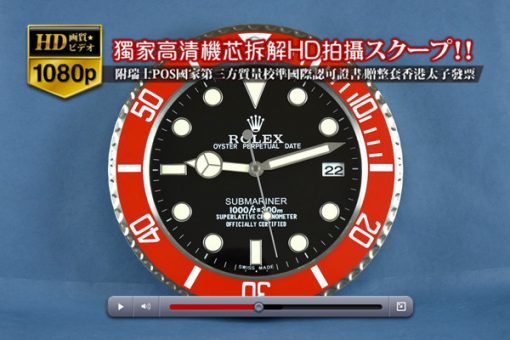 Rolex勞力士 Submariner系列-壁掛時鐘 不銹鋼外殼-搭配機械走秒石英機芯 系列 Submariner尺寸 直徑35cm x厚度5cm機芯 機械秒石英機芯,使用AA 1.5V電池一顆功能 時針、分針、秒針、日期(3點位窗式顯示)材質 304型材不銹鋼-磨砂工藝圈口 紅色-鋁合金-陽極氧化玻璃材質 透明玻璃表盤 黑色面盤、夜光顯示時標